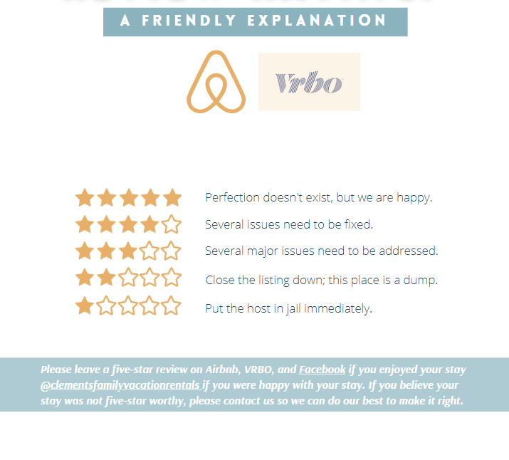 Please leave a five-star review on Airbnb, VRBO and Facebook if you enjoyed your stay @TheCullmanHAus. If you believe your stay was not five-star worthy, please contact us so we can do our best to make it right.